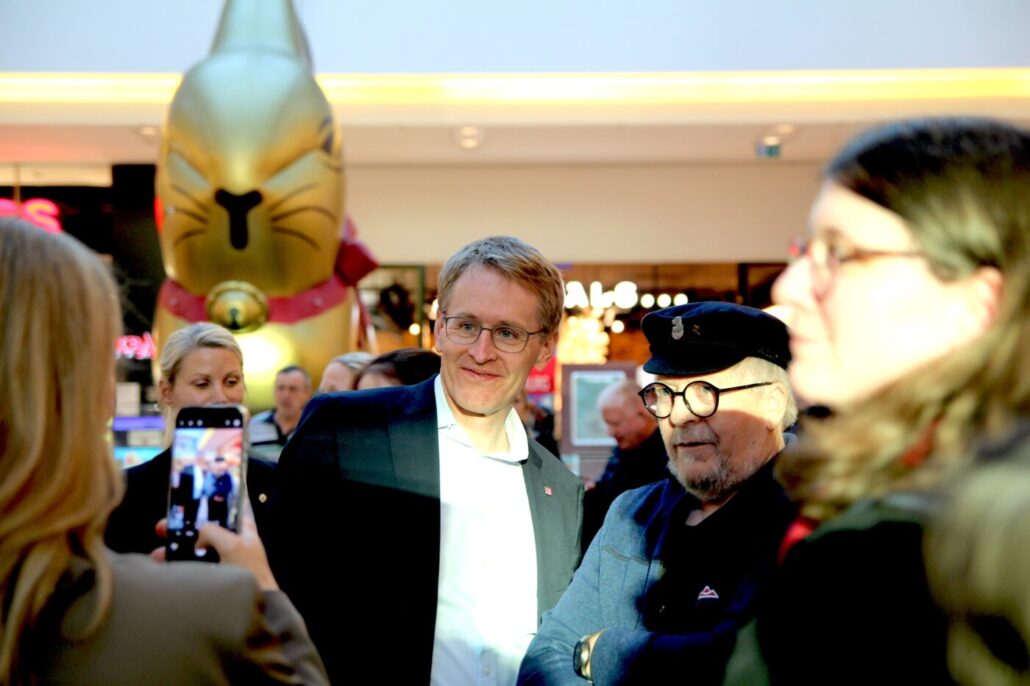 Begleitet vom Gründer und Inhaber Gerhard Lütje startete der Ministerpräsident einen kurzen Gang durch die Passage, die sich über fünf Jahrzehnte zu einem Herzstück des Flensburger Handels entwickelt hat. Überall dort, wo die Delegation haltmachte, suchten die Besucher die Nähe zum Landesvater. Ob für ein schnelles Selfie oder ein kurzes Wort über die aktuelle Lage im echten Norden – Daniel Günther zeigte sich nahbar, bevor der offizielle Teil des Abends seinen Höhepunkt erreichte.