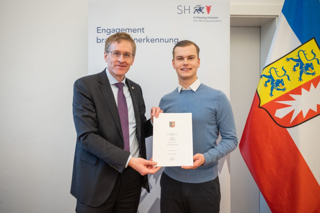 Felix Kähler aus dem Kreis Pinneberg wurde von Ministerpräsident Daniel Günther mit einer Anerkennungsurkunde für eine Rettungstat ausgezeichnet. Der 21-jährige Student hatte am 7. September 2025 einem körperlich mehrfach beeinträchtigten Senior das Leben gerettet.