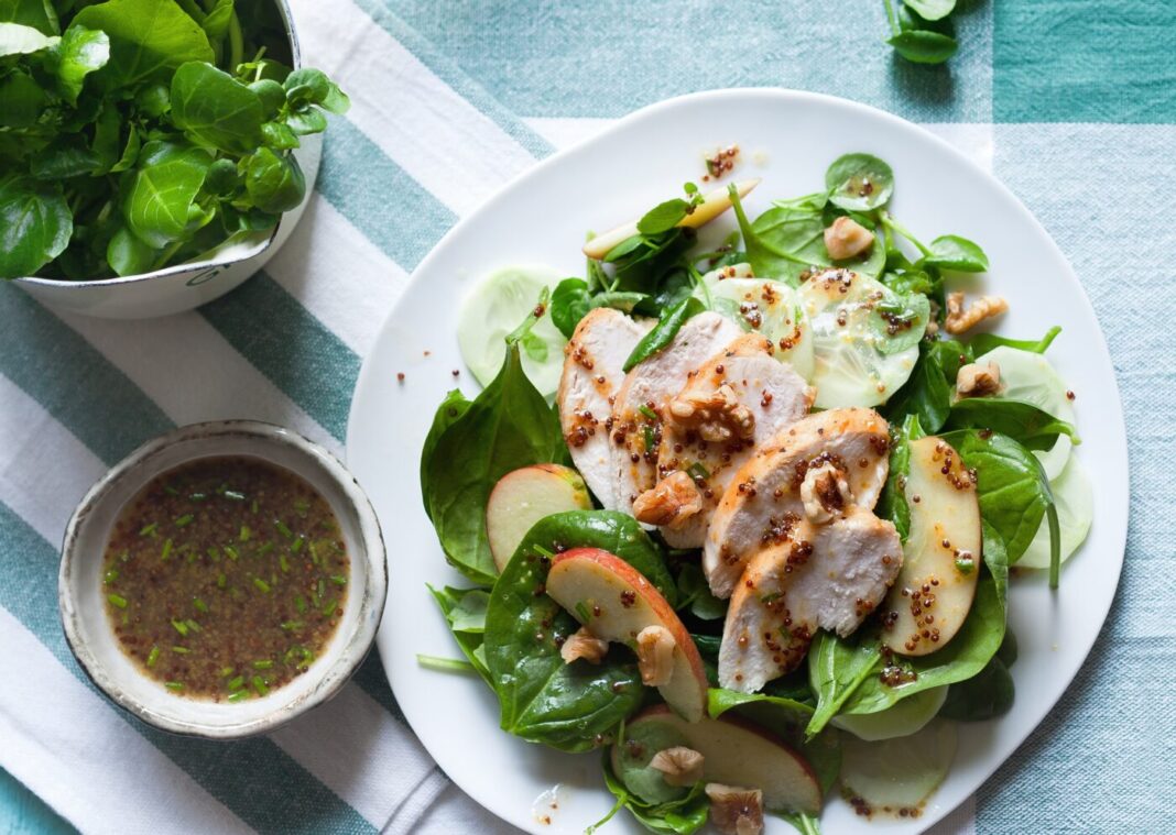 Zartes Hähnchen, knackige Gurke, frischer Spinat und würzige Brunnenkresse treffen auf süß-säuerlichen Apfel und ein feines Honig-Senf-Dressing. Ein leichter, aromatischer Salat, der Frische auf den Teller bringt und perfekt für die ersten warmen Tage ist.
