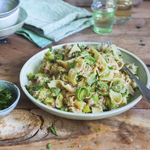 Herzhaft, aromatisch und wunderbar unkompliziert: Diese Bandnudeln bekommen durch gerösteten Grünkern eine feine, nussige Note, während Porree und Staudensellerie für Frische und Biss sorgen. Abgerundet mit cremiger Sauce und frischen Kräutern entsteht ein rundes Pastagericht, das sättigt, ohne schwer zu wirken.