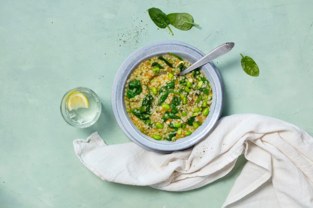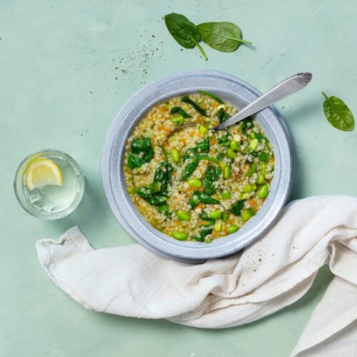 Herzhaft, unkompliziert und wunderbar frisch: Dieses One-Pot-Gericht vereint nussige Graupen mit zartem Spinat, knackigen Edamame und duftenden Kräutern. Alles gart entspannt in einem Topf zu einer cremigen, aromatischen Mahlzeit, die leicht sättigt und gleichzeitig richtig gut schmeckt. Ein Klecks pflanzlicher Joghurt sorgt für eine feine Frische.