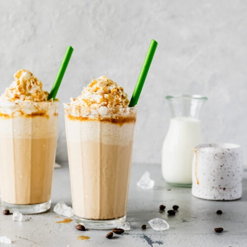 - Frappuccino in die 4 Gläser geben, mit geschlagener Sahne toppen, mit etwas Karamellsoße garnieren und servieren.