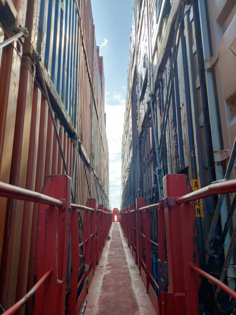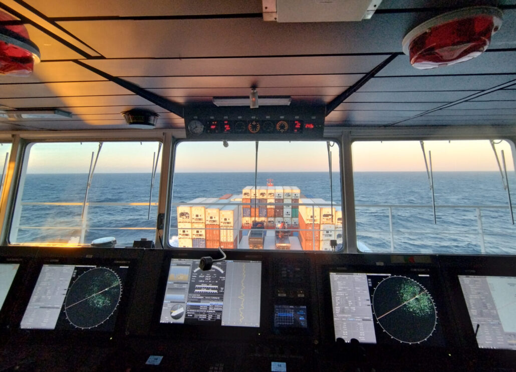 Wir arbeiten im Dreischichtsystem. Meine Wache läuft von 8 bis 12 Uhr und abends von 20 bis 24 Uhr. In dieser Zeit sitze ich auf der Brücke und fahre das Schiff – bei guter Sicht allein, nachts oder bei eingeschränkter Sicht mit Ausguck. Hinzu kommen regelmäßige Kontrollen von Feuerlöschern, Rettungsringen und Co.. Im Hafen wechseln wir auf 6‑Stunden‑Wachen. Dann überwachen wir das Be- und Entladen, prüfen Containerpositionen und kontrollieren die Festmacherleinen.