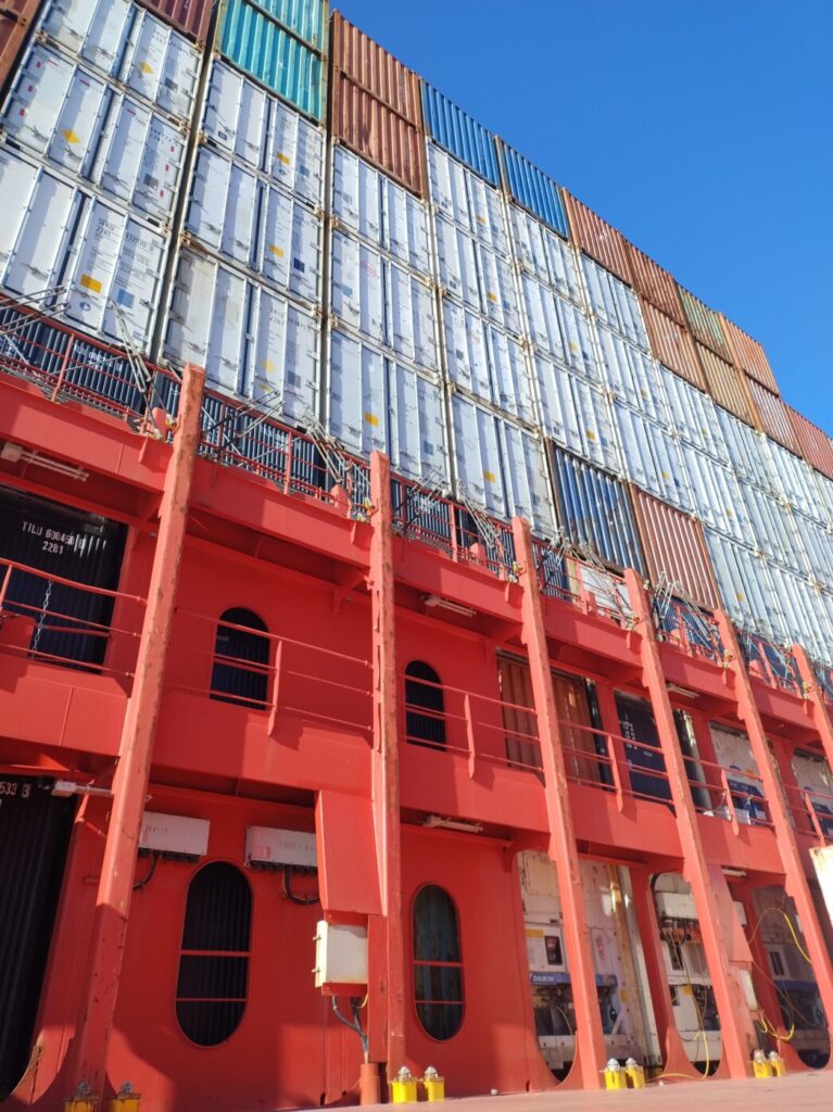 Alles. Wir sind ein normales Containerschiff. Von Kühlcontainern mit Fisch über kleine Boote und LKWs bis zu Umzugskartons wird alles aufgeladen, was von A nach B muss.