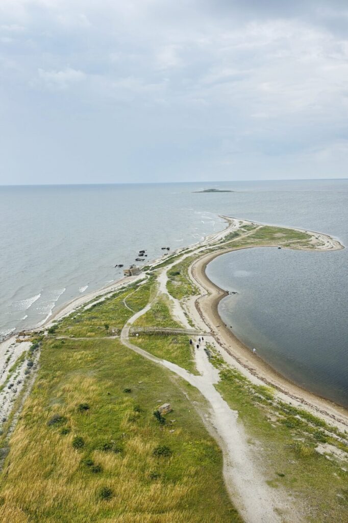 Von Virtsu setzen wir nach Muhu über. In Liiva stoppen wir kurz für Vorräte – und stolpern gegenüber des Supermarkts über eine bunte Meile aus Foodtrucks. Auf dieser kleinen Insel: unerwartet. Noch überraschender: Hier bekommen wir eine der besten Pizzen unseres Lebens serviert – Schmand, Lachsforelle, Dill. Über den Damm rollen wir weiter nach Saaremaa, Estlands größter Insel. Hier ticken die Uhren anders: kleiner, leiser, entspannter. Die Küsten locken, länger zu bleiben als geplant. Im Süden ragt der Sõrve-Leuchtturm 52 Meter in den Himmel. Der Aufstieg brennt in den Waden, der Rundumblick belohnt: freie Sicht auf Meer, Insel und die Landzunge zu seinen Füßen.